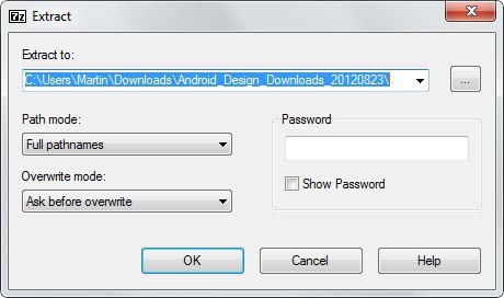 The basic extract dialog lets you pick a folder on your hard drive that you want to unpack the archive to. You can also set a password here if that is required, select the overwrite mode or path mode: