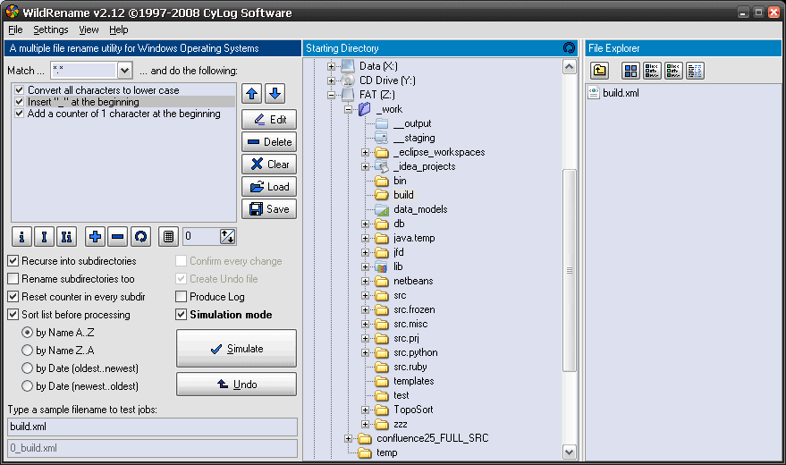 This preview function makes Wild Rename interesting for complex jobs. It provides two ways to preview the output. The first is by entering a sample filename and watching how it will look like after the renaming and the second, far more interesting, is the so called simulation mode. All files and directories are virtually renamed and the results are displayed. It is therefor possible to check exactly how all files and directories look like after running them through the renaming functions.