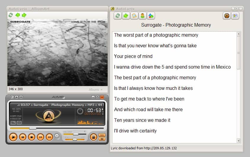 The software will automatically search the Internet for information about the current song and display the album art and lyrics in two independent windows. It is possible to refine the search if the first hit did not display the correct items. It can happen that the lyrics are not the only information displayed as the software uses an auto parser to parse the contents.