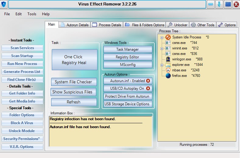 The Open Source software can aid users in the removal of effects on the Windows file system and the Windows Registry. One of the main features of it is that it can re-enable access to the Windows Task Manager, Registry Editor, MSconfig and the Process List.