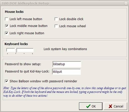 The left, middle and right mouse can be locked individually as well as the double-click and the mouse wheel. The degree of the keyboard lock can be customized using a slider which ranges from no locks at all to a complete lock of the computer keyboard.