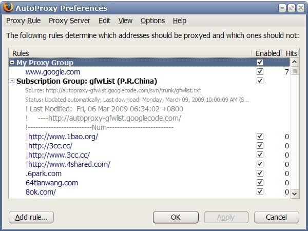 AutoProxy is a useful extension for the Firefox web browser. It has its uses for Firefox users who need to use proxies in some environments but not in others, and Firefox users who need to use proxy servers for select sites to access them at all. This can be used to overcome censorship for instance, or blocked resources on the ISP or service level.