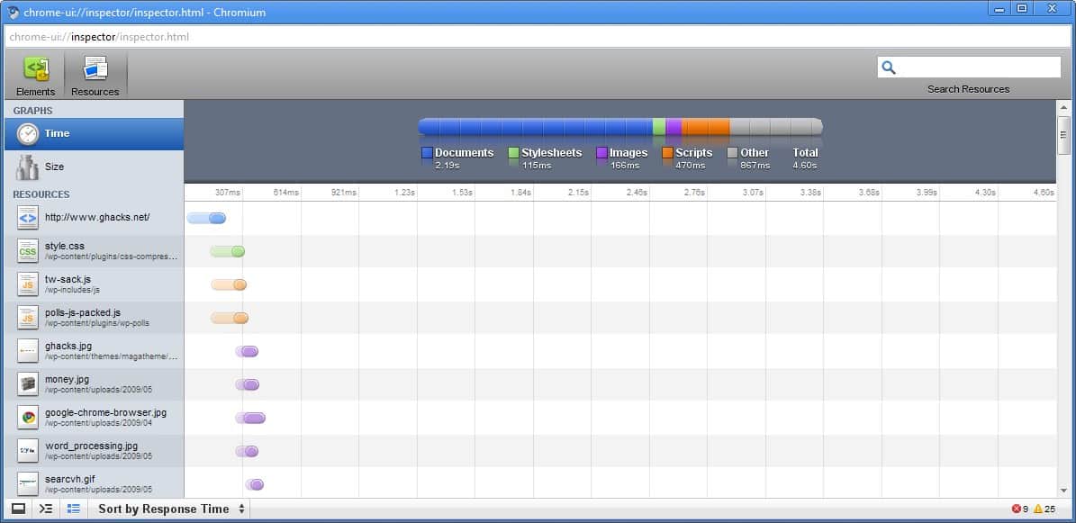 The tab Resources displays the loading time and size of all elements on that specific webpage. Resources are further divided into categories like scripts, images or documents.