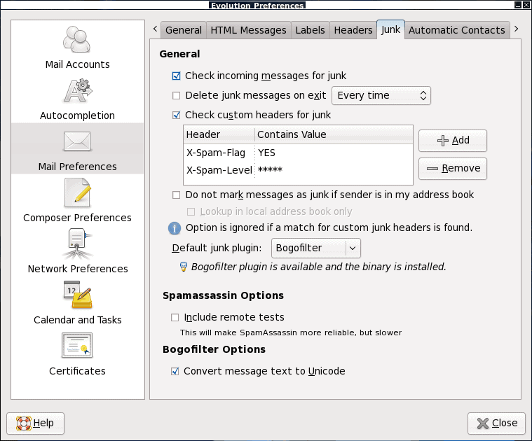 Now that the plugin is enabled, it's time to configure it within Evolution. Go back to the Edit menu and select Preferences. When the Preferences window opens up click on the Mail Preferences button and then the Junk tab (see Figure 1).