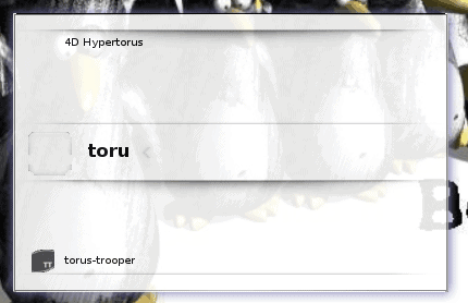 In some desktops you will have a "Run prompt" within your Start menu. In GNOME and KDE you can open up this dialog by pressing Alt-F2. In my favorite distribution, Elive Compiz, I set this to the Windows Key+F1. Figure 1 shows the Run Dialog in Elive. As you can see I want to start the game Torus Trooper. I start to type "torus" and the first matching entry pops up which I can click on to start up the application.