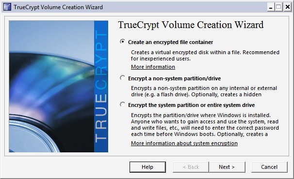 Start by downloading True Crypt from the official website. Click on the Create Volume button after installation. This opens a wizard that can be used to create an encrypted file container.