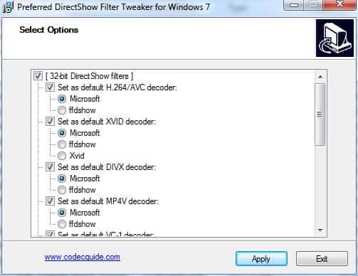 The Microsoft filters are selected by default. All it takes to switch to another filter is to select it from the list. A click on the apply button afterwards will make the changes to the system. Please note that these changes only affect media players that use Direct Show to decode the video and audio codecs.