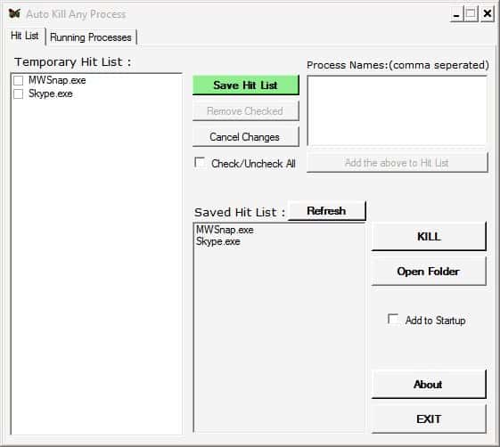 The software program works with a so called hitlist that is configured in the program's settings. The hitlist basically contains names of processes that the user wants to include in the kill command. New processes can be added from the list of running processes that are displayed in an extra tab in the program or by entering the name of the process manually in a comma separated list in the interface or the hitlist.txt file directly.