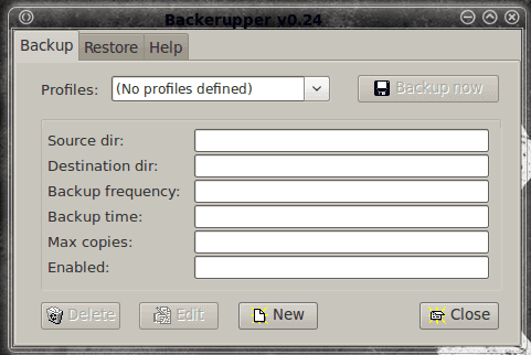 Now let's see how Backerupper is used. When you issue the command backer the main window will appear (see Figure 1). As you can see there are no profiles created by default. In order to create a profile you need to click the New button. When you click this button a window will appear (see Figure 2) asking for the details of this profile. The details should be fairly obvious. You can create a profile for every backup you want to create. This window is also where you set up the
