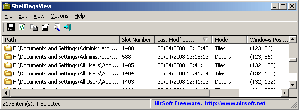 A more practical solution is Shell Bags View, a Nirsoft application, that will display the information in its interface. Shell Bags View is the typical Nirsoft application. It is portable and works with a wide variety of Windows operating systems. The program displays the folder information that is stored in the Windows Registry upon startup.