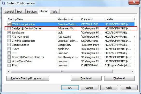 The startup tab in the System Configuration window contains the startup entries. Some of them might be disabled already. All items with a checkmark are enabled and will be executed on system start. Removing the checkmark from Catalyst Control Center ensures that mom.exe and ccc.exe are not executed on system startup.