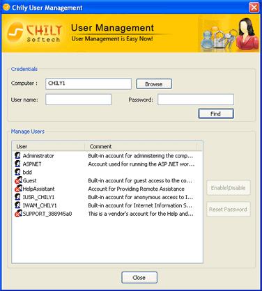 Please note that you may not be able to enable or disable some accounts depending on the account type. It is for instance not possible to enable the built-in Administrator account using the User Management software.