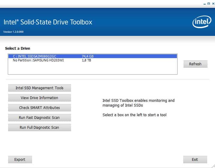 The Intel Solid State Drive Toolbox is a Windows software program that can be used to optimize and analyze Intel SSDs that are installed in the computer system. It supports running regular optimizations that make use of the above concepts to retain the drive's performance over time. It can furthermore be used to view drive information, check the Solid State Drive's SMART attributes and run a fast and full diagnostic scan on the selected drive.