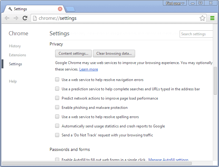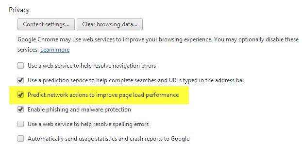 - Locate "Predict actions to improve page load performance" and uncheck the option.