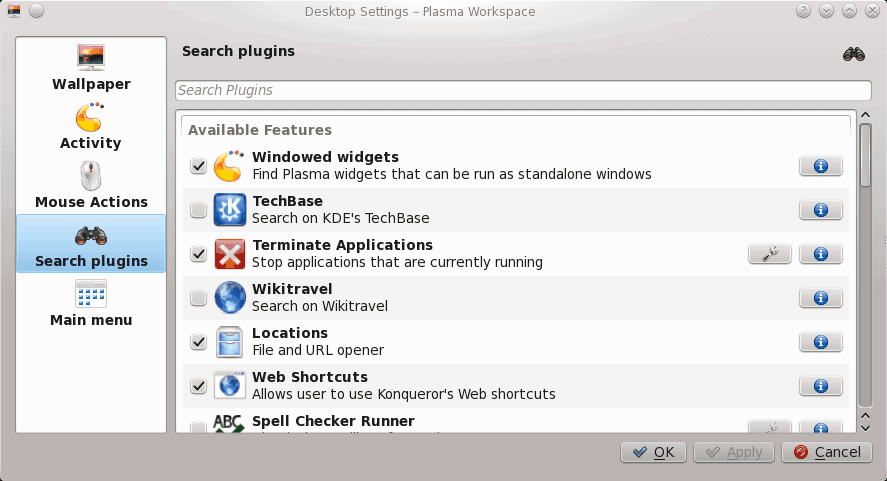 If you click the Cashew for the Search and Launch (this will be in the upper left corner) you can click the Configure Search and Launch Containment. In this configuration window (see Figure 3) you can configure the background, the name of the activity, the mouse actions, enable/disable plugins, and what is included in the main menu.