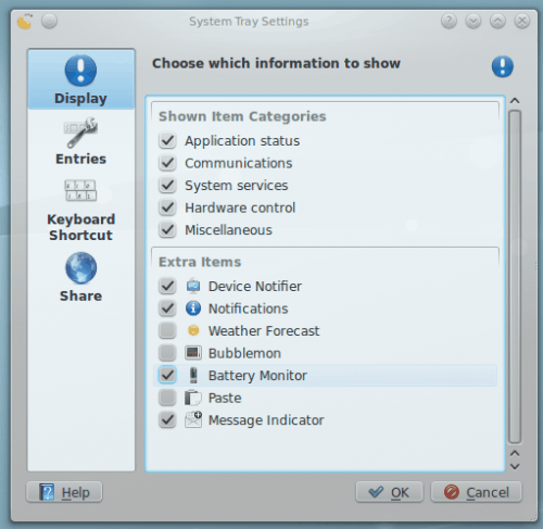 From the configuration window (see Figure 3) you can configure what information to show, the visibility of each entry (if an entry is hidden, auto-hidden, or always visible), keyboard shortcuts (there are none by default), and you can share the widget across a network.