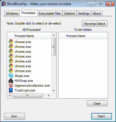 Blind Bosskey Lite - professional application that makes use of "hide-lists". The user can add windows, process and executables to the hide list, to hide all selected items with a hotkey or a click on the system tray icon.