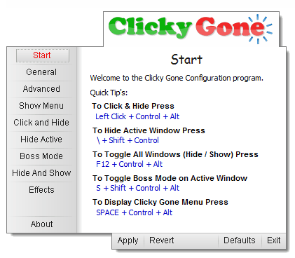Clicky Gone - Open Source software that is offered as a portable version and an installer. Can hide all or selected applications, lots of hotkeys and settings. May take a bit longer to get used to.