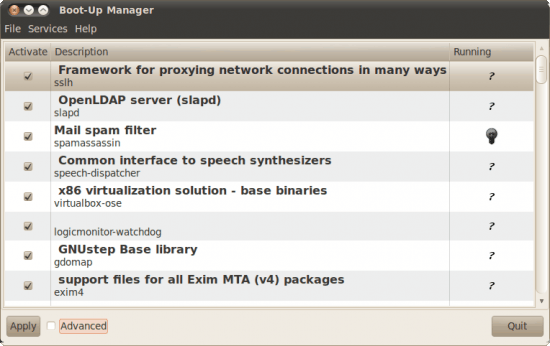 To fire up BUM issue the command sudo bum. I assume you have administrative rights. If you do not you will not be able to use this tool. When you have BUM up and running it will default in basic mode. In this window (see Figure 1) you can select which services you want to run by checking or unchecking the associated check box. If you make a change to a service  you have to click the Apply button to apply the change. But when you simply uncheck (or check) a box you are changing the startup status of the service. In other words, that status will only change upon the next boot of the machine. You can alter a services current status from with BUM by selecting  service and then clicking Services > Start or Services > Stop. Advanced mode As I said, by default BUM starts in basic mode. This mode offers one tab which is just a system summary mode, which is meant as an overview mode. The advanced mode The advanced mode can be selected by selecting the check box next to Advanced in the bottom left corner of the main window. When you toggle this mode you will see two new tabs: