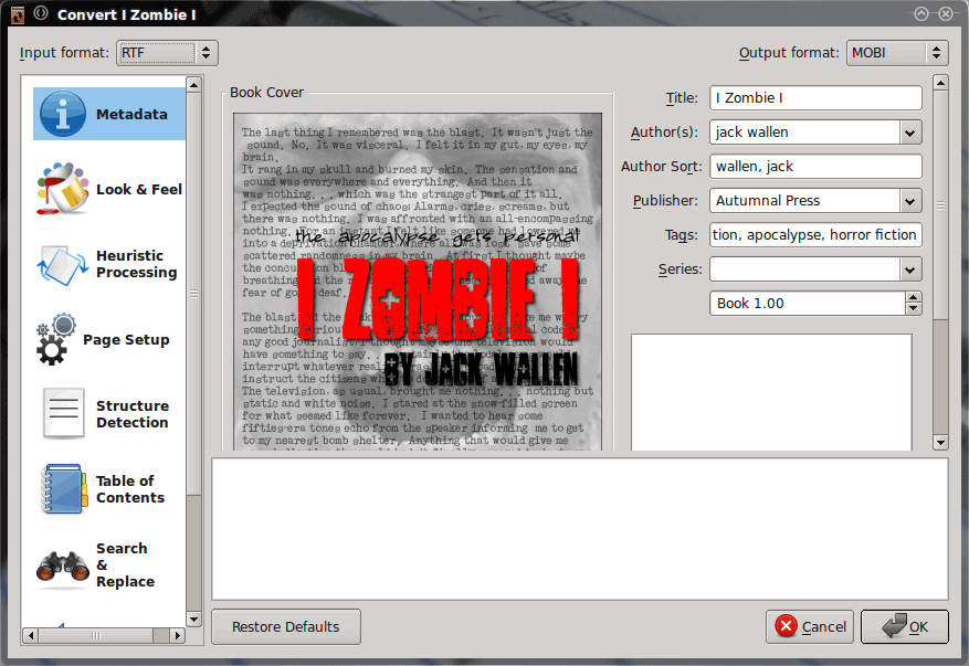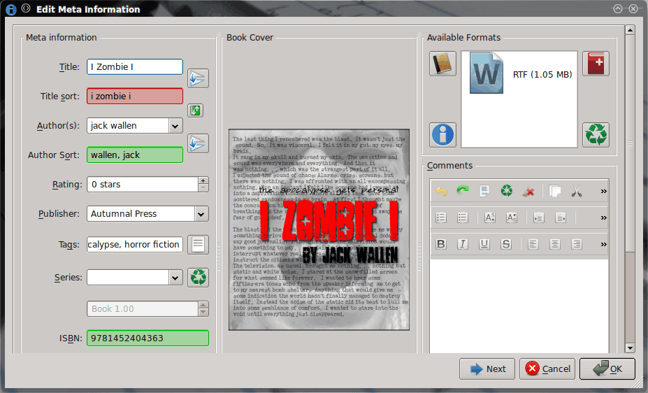 I won't go into detail about managing your books in Calibre. But I did want to mention how metadata is edited. By editing the meta data of your books you can change/add the following: