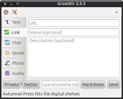 As a writer of ebooks I have to constantly be promoting my works. There are three main ways to do this for free: Twitter, Facebook, and Tumblr. Of the three, Tumblr allows me to be the most flexible in what I post as well as allows more people to see what I'm posting. But I don't always like to be at the mercy of a web browser. So to interact with Tumblr from the Linux desktop I opted for a very nice tool called Grumblr.