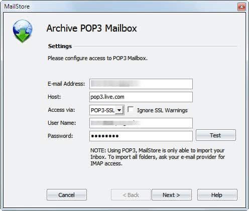 Yup, it does. In MailStore, choose POP3-SSL from the drop-down box (it will default to the required port 995). User name should NOT include “@hotmail.com”