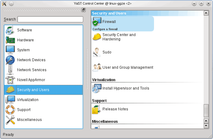 I want to concentrate on the Security Center in YaST. Click on that entry in the Security and Users section and a new window will open.