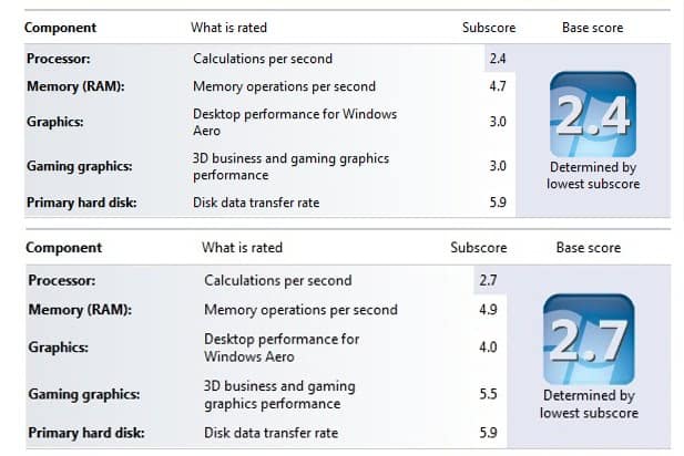 In the image above we have the Windows Experience Index scores for two Windows 7 tablets, the top one running an Intel Atom dual-core processor running at 1.66GHz, and the bottom score running the AMD C-50 chip running at just 1GHz.