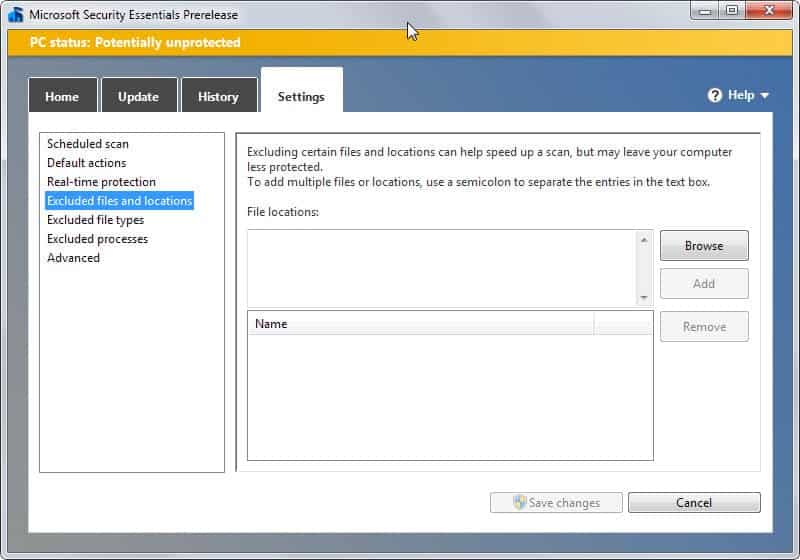 The second option excludes certain file types form scans. You can add them manually this time and need to separate individual items with a semicolon. This can be useful to block file types such as jpg or avi from being scanned by Microsoft Security Essentials regardless of location on the system.