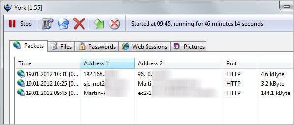 York is an interesting program as it looks for specific data in the network traffic right away; it lists passwords, pictures, and files that it detects right away in tabs so that you may see on first glance if passwords, images, or files are transferred over the monitored network.