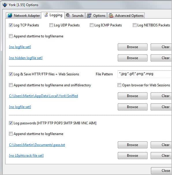 Data is not logged into files by default. You can, however, open the program settings to select log files on your system that you want the data to be saved to. The logging options are quite extensive, with options to log passwords, files, web sessions, and packets independently.