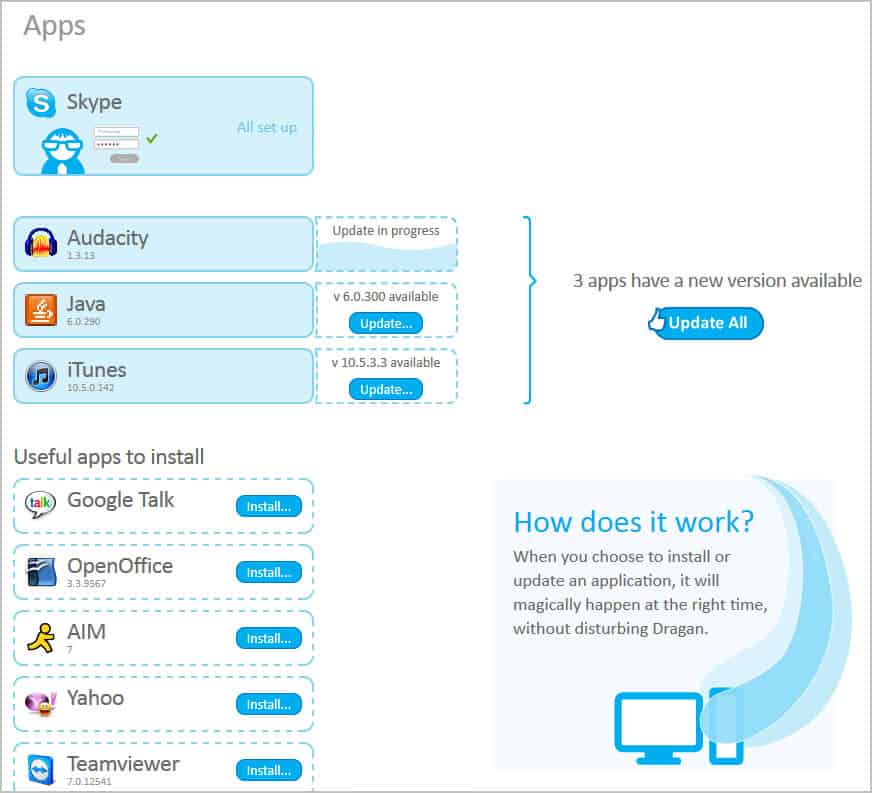 Just click the update or update all button to update all applications silently in the background. It is furthermore possible to install popular applications such as Open Office, Teamviewer or Adobe Reader from the web interface. All of this happens without disturbing the user working on the PC.