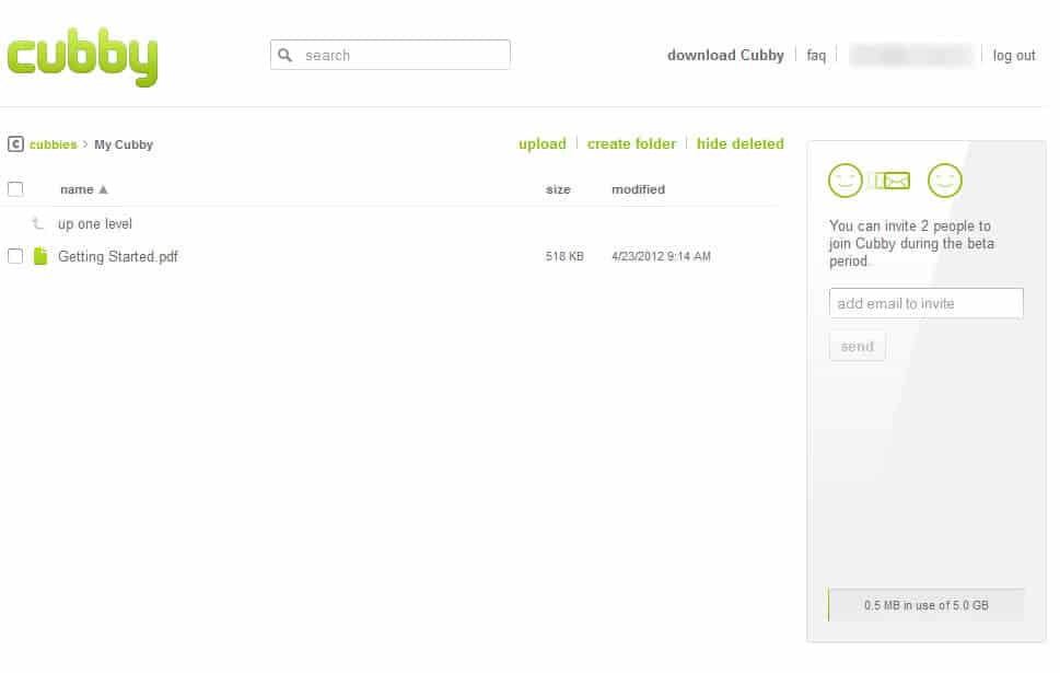 You can log into the Cubby website with the same login credentials that you have selected during setup. All files and folders that you are syncing with the cloud are listed here, with options to upload new files or folders directly from within the web interface. Files can be downloaded, but not deleted or modified. Deleted files can however be displayed in the web interface.