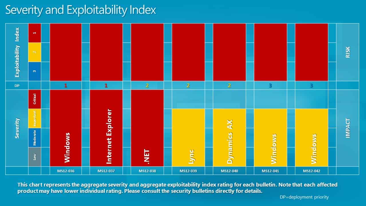 Take a look at the Bulletin Deployment Priorities, and the Severity and Exploitability Index below. The first is a suggestion by Microsoft on how the bulletins should be deployed on affected systems, the second a visual representation of the risk and impact of each individual bulletin.