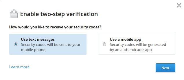 As you can see, you can select to get the security codes sent to your mobile phone, or use an authenticator app instead. Dropbox at the time of writing supports Google Authenticator, Amazon AWS MFA and Authenticator for Windows Phone 7.