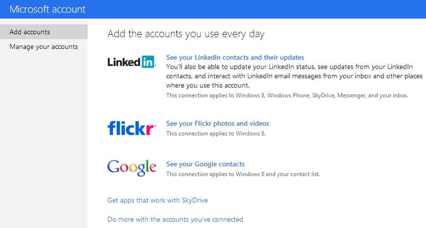 One of the coolest new features is the ability to connect with other services like Facebook, Twitter, Google, and more. To get started with this you will actually need to visit your Microsoft account (formerly known as a Windows Live account). Â Here you can click the "Add accounts" option from the left menu bar. Â This will take you to a screen that displays available accounts to connect with. Â Those already connected can be found under "Manage your accounts". Â