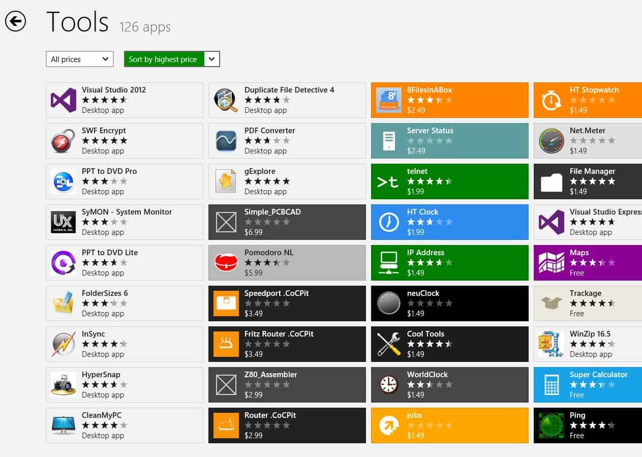 The sorting is broken. And not just one of the sorting options. First of all, when you sort by highest price, you end up with desktop apps listed in front of store apps as the majority are more expensive than apps. The problem here is that there is no price listed for desktop apps, and that there is no option to hide desktop apps from being listed in the store.