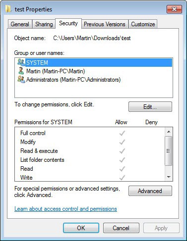 To set permissions manually you right-click the folder in Windows Explorer and select properties from the context menu. Switch to the security tab in the new properties window and check if your user name is listed under group or user names.