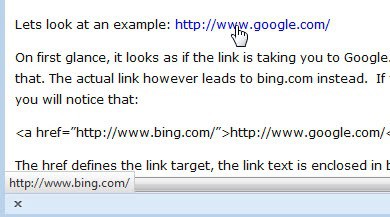 On first glance, it looks as if the link is taking you to Google.com, right? The link text suggests that. The actual link however leads to bing.com instead.  If you look at the actual source code,  you will notice that: