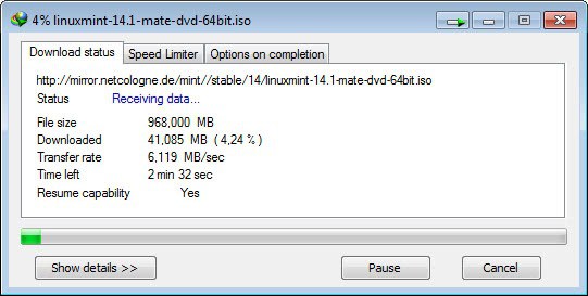 Internet Download Manager promises faster download speeds, lets see if that is the really the case. A test download of the latest Linux Mint version, a 960 Megabyte download, completed in 2 minutes 44 seconds and about 3 additional seconds to combine the parts that were downloaded. This maxed out the download bandwidth of the Internet connection. The same download using Google Chrome's internal download manager took 3 minutes and 4 seconds to complete.