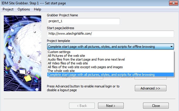 If you need to download a lot of files from a single site, you may want to use the built-in Grabber module which lets you do that. It supports authorization if needed and enables you to download a lot of pictures, audio files or any other type of file from the selected address. You can select one of the available templates that the program ships with, or configure your own custom template instead.While optimized for file downloading, it can actually also be used to download a complete website to your local system.