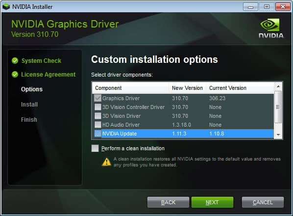 It is therefore highly recommended to custom install Nvidia graphics drivers and not use the express installation option that the installer offers.