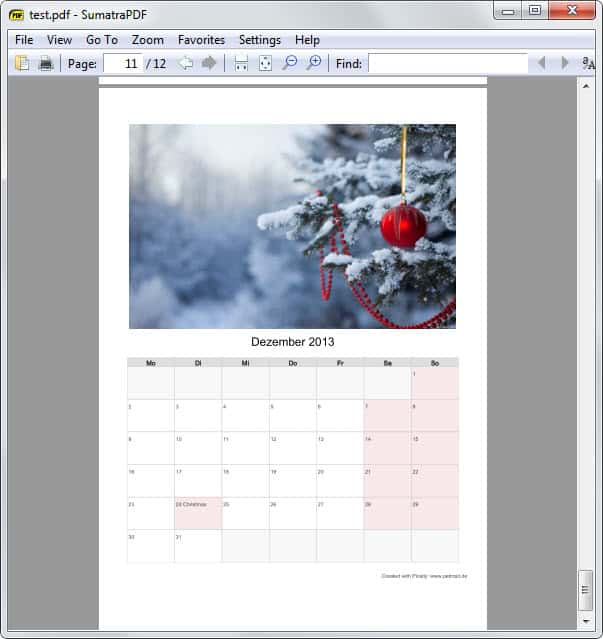 The calendar is saved as a pdf document that you can then open in a compatible reader to use it on the computer or to print it out. The program displays a donation request after the generation of the calendar.