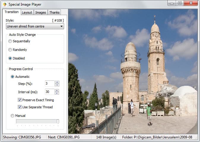 The transition tab defines the style or styles used when the app switches between pictures. You can select a single style or configure it to go through all styles sequentially or randomly. The progress control lets you set the transition time, steps and a couple of other related settings.