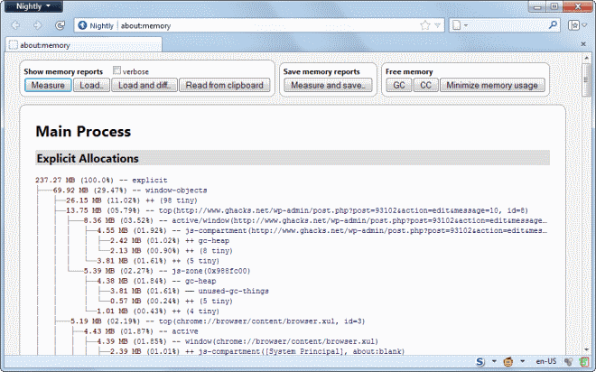 The about:memory page has been modified. First, it won't display data on load like it did before. You need to click on one of the buttons, e.g. measure or load, to display the browser's memory allocations.