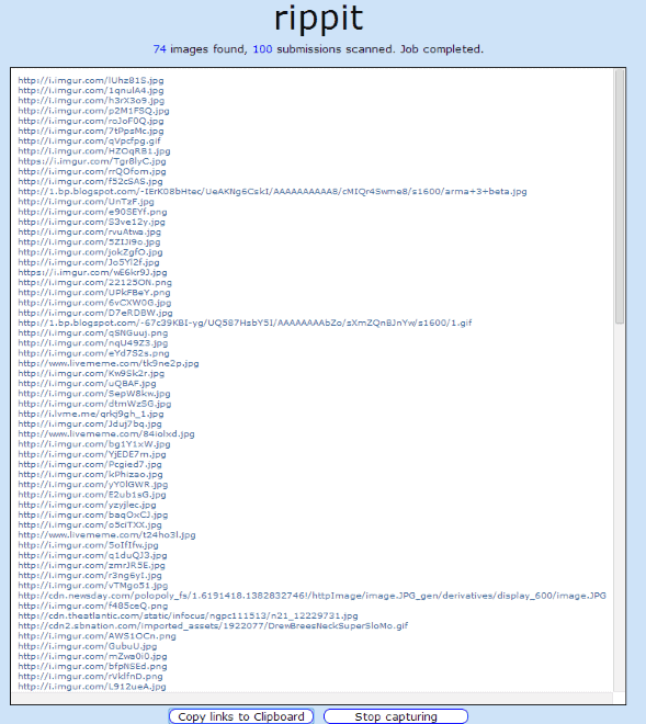 Rippit is excellent for mass-downloading images that have been submitted to Reddit. It works great on all image related subreddits including /r/wallpapers/, /r/earthporn/ and even on the raunchy parts of Reddit such as /r/gonewild/.