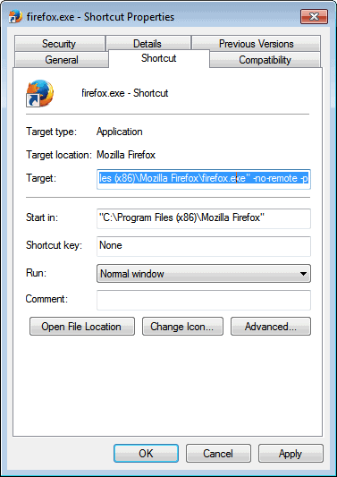 - The full line should look like this now: "C:\Program Files (x86)\Mozilla Firefox\firefox.exe" -no-remote -p test