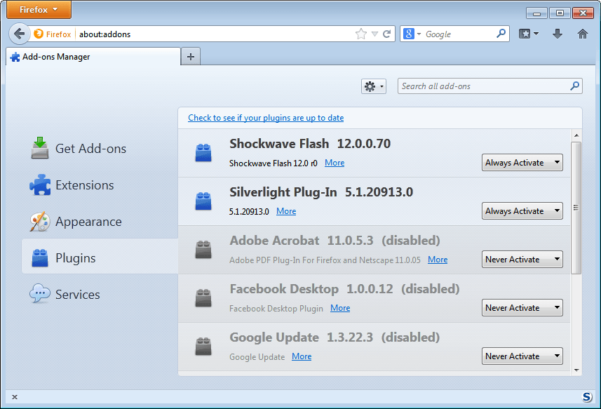 - Disable, enable, or set to click to play any of the plugins that you want to use.