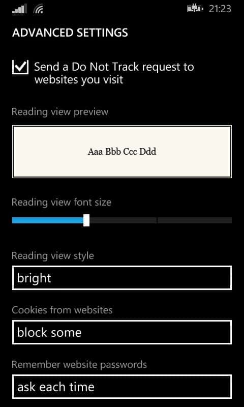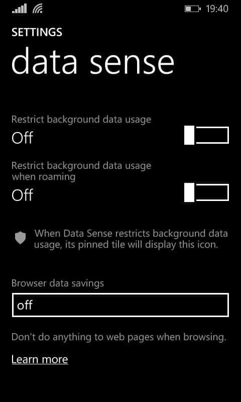 The address bar button (button to left of address bar) , previously used for refresh/stop is now for tabs/favourites (configure via Settings). The next photo shows IE settings, which reveal Data Sense saving feature, similar to various browsers that have data compression feature (like Opera Mini). The intensity of data saving can be configured from standard to high, and you can have it turn on automatically when required, or off at all times.