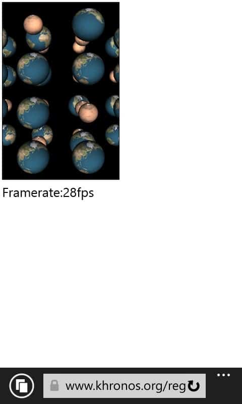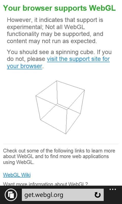 WebGL support is also available and I have attached screenshots of two Khronos WebGL tests.